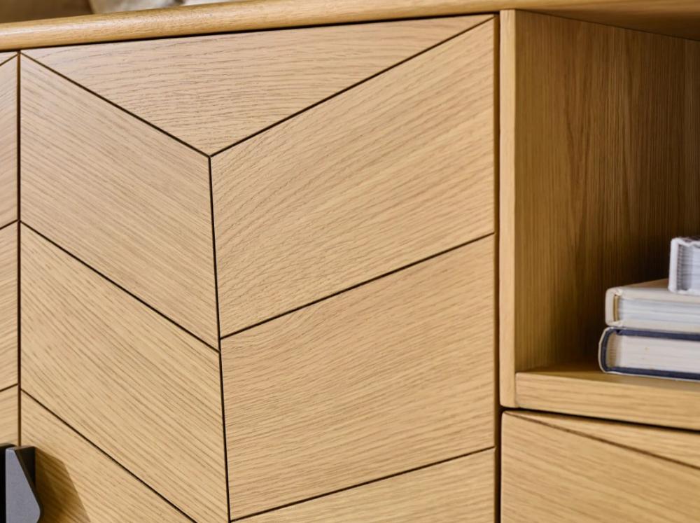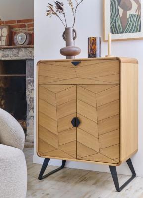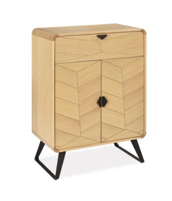 Le bibus 2 portes Tokyo séduit par son décor façon chevron, un détail graphique qui apporte rythme et caractère au mobilier contemporain. Son placage chêne, mis en valeur par des arrondis en bois massif, crée une présence chaleureuse qui s’intègre facilement dans un salon ou une entrée. Placé près d’un fauteuil de salon ou d’un buffet bas, il structure élégamment l’espace.