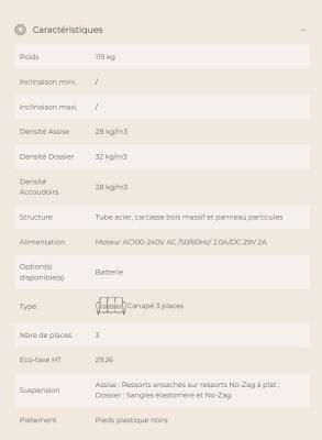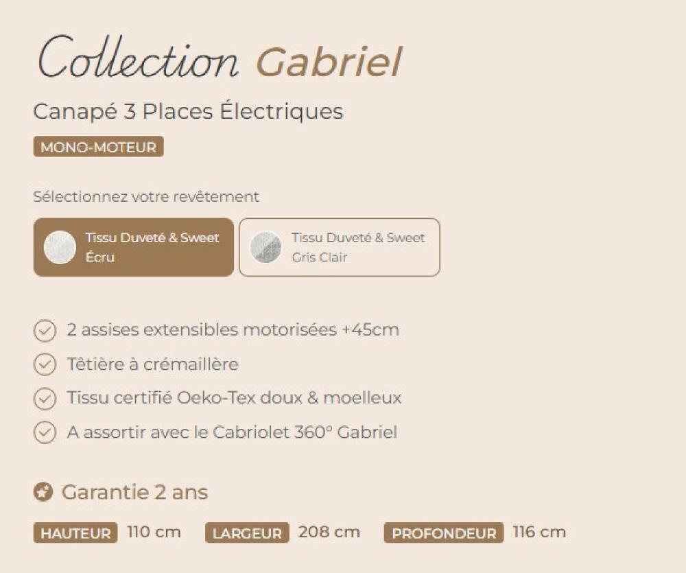 Ce canapé 3 places offre un confort optimal grâce à ses assises extensibles motorisées jusqu’à +45 cm et sa têtière ajustable à crémaillère. Son design moderne s’adapte facilement à tous les intérieurs. Il s’associe parfaitement aux autres modèles de la collection Gabriel.