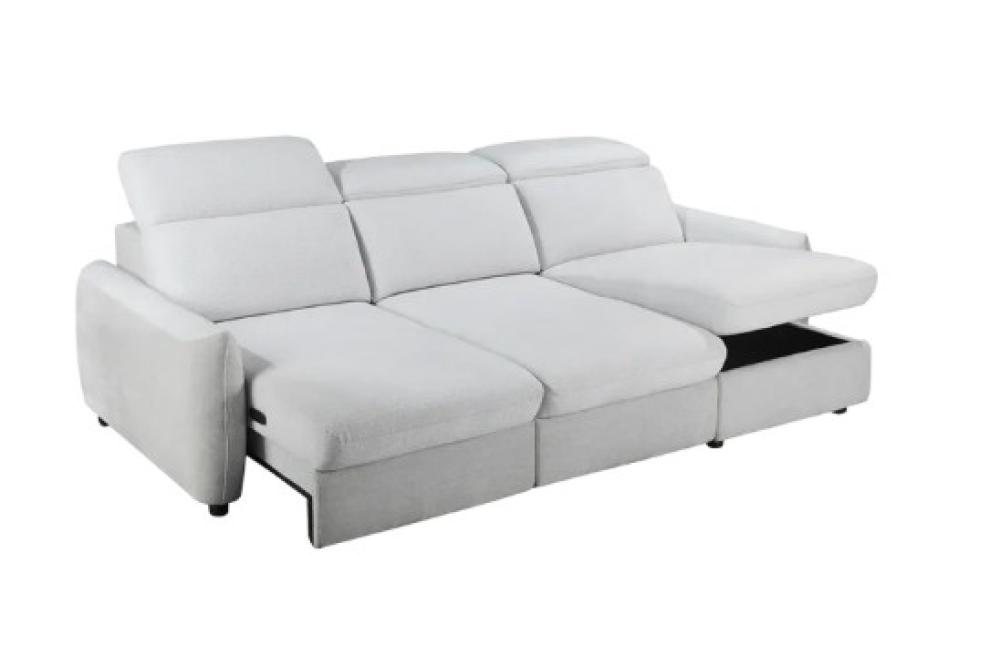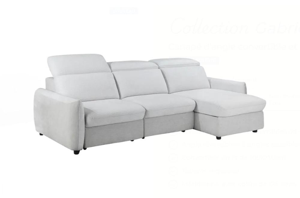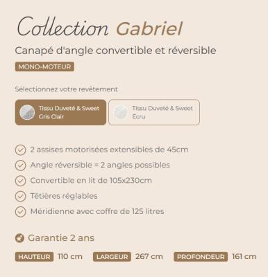 Le canapé d’angle Gabriel combine confort et praticité avec son angle réversible et ses deux assises motorisées avance/recul. Son tissu doux et moelleux « duveté et sweet » invite à la détente. Fonctionnel, il offre un grand coffre de 125L et un couchage d’appoint de 105x230 cm. Son atout principal : sa modularité.
