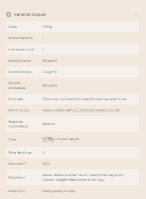 - Assise : Ressorts ensachés sur ressorts No-Zag à plat , Dossier : Sangles élastomère et No-Zag