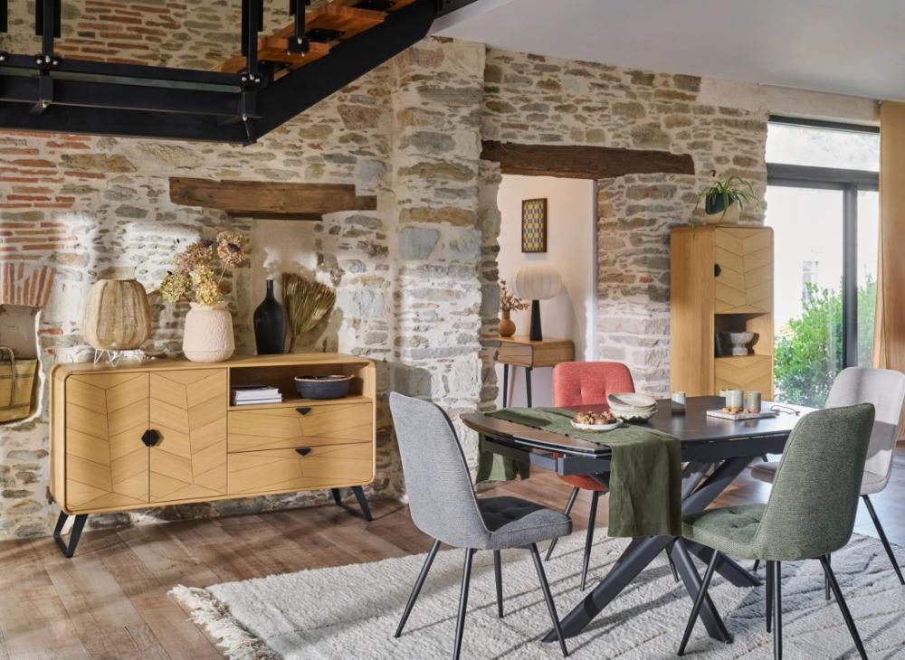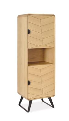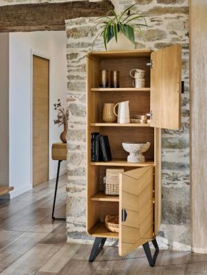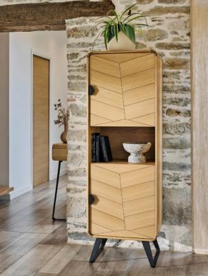 La colonne 2 portes Tokyo apporte une note graphique au salon grâce à son décor façon chevron, subtil et contemporain. Son placage chêne et ses arrondis en bois massif lui
