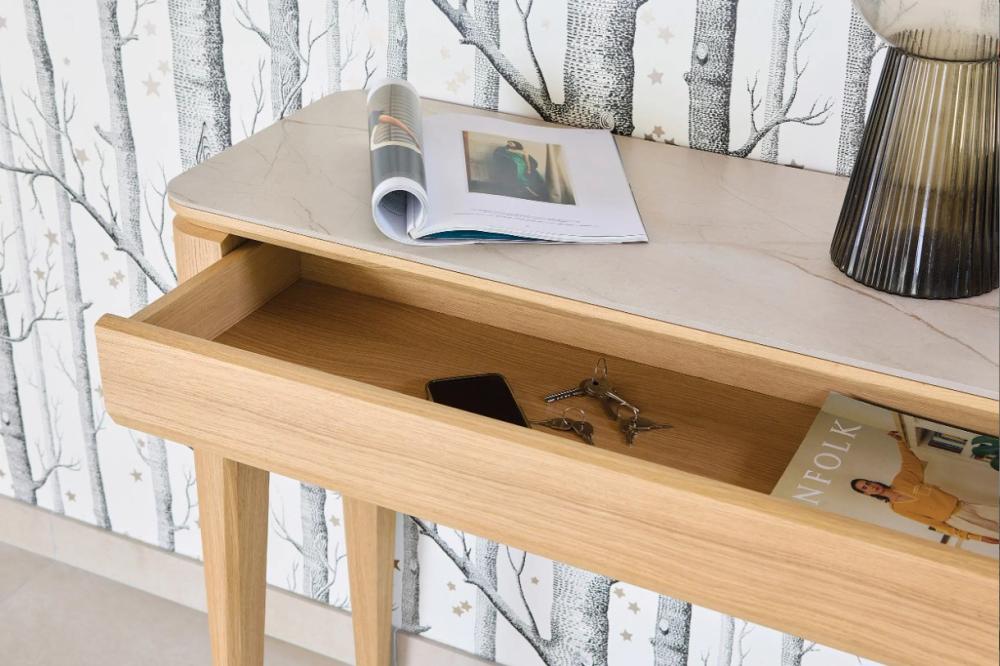 Déclinée en enfilades, vitrines, meubles TV, bibus, consoles, tables de salon et tables de repas, la collection Minérale s’adapte à tous les intérieurs contemporains. Les finitions en céramique beige veiné ou brun panaché renforcent son élégance naturelle et sa durabilité.