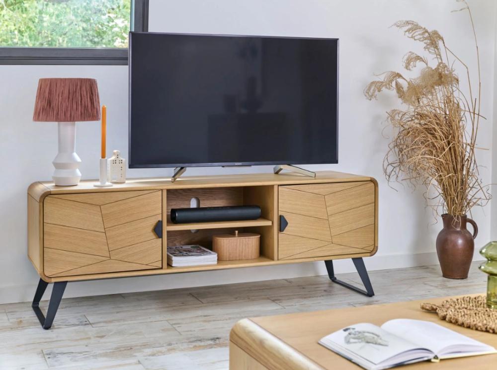 Conçu pour répondre aux besoins du quotidien, il offre deux portes à amortisseurs et une niche centrale avec tablette réglable. Cet agencement en fait un meuble TV bois fonctionnel, idéal pour organiser box, lecteurs, consoles ou accessoires tout en conservant une façade soignée. Ses proportions généreuses permettent d’accueillir aisément un écran large, tout en structurant visuellement l’espace.