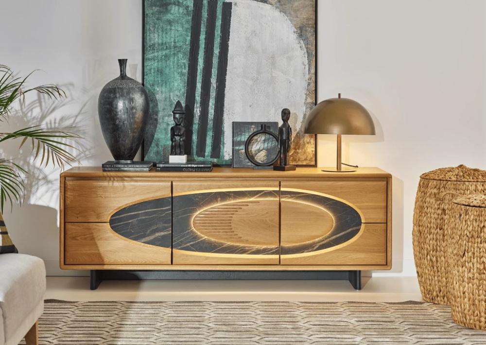 Support en médium 13mm toujours laqué noir mat, panneaux décors en chêne massif vissés depuis l'arrière des panneaux support.
