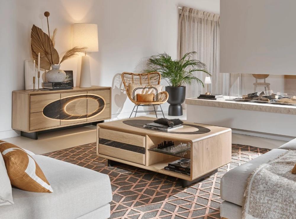 Décors en céramique marbrée maintenus en feuillure dans les décors chêne.