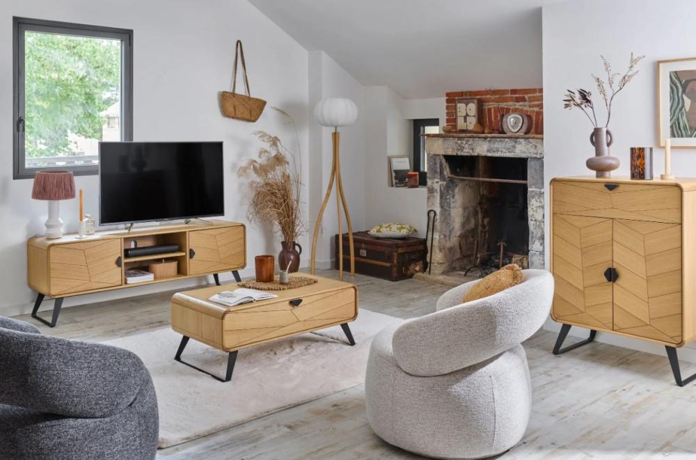 La table de salon Tokyo s’impose par son allure contemporaine et son élégance naturelle. Son décor façon chevron, subtilement travaillé sur le tiroir, apporte une identité forte et s’accorde parfaitement avec un intérieur de mobilier contemporain. Le placage chêne, présent sur le dessus et les côtés, donne à l’ensemble une chaleur authentique qui se marie aisément avec un fauteuil de salon ou un meuble buffet aux teintes douces.