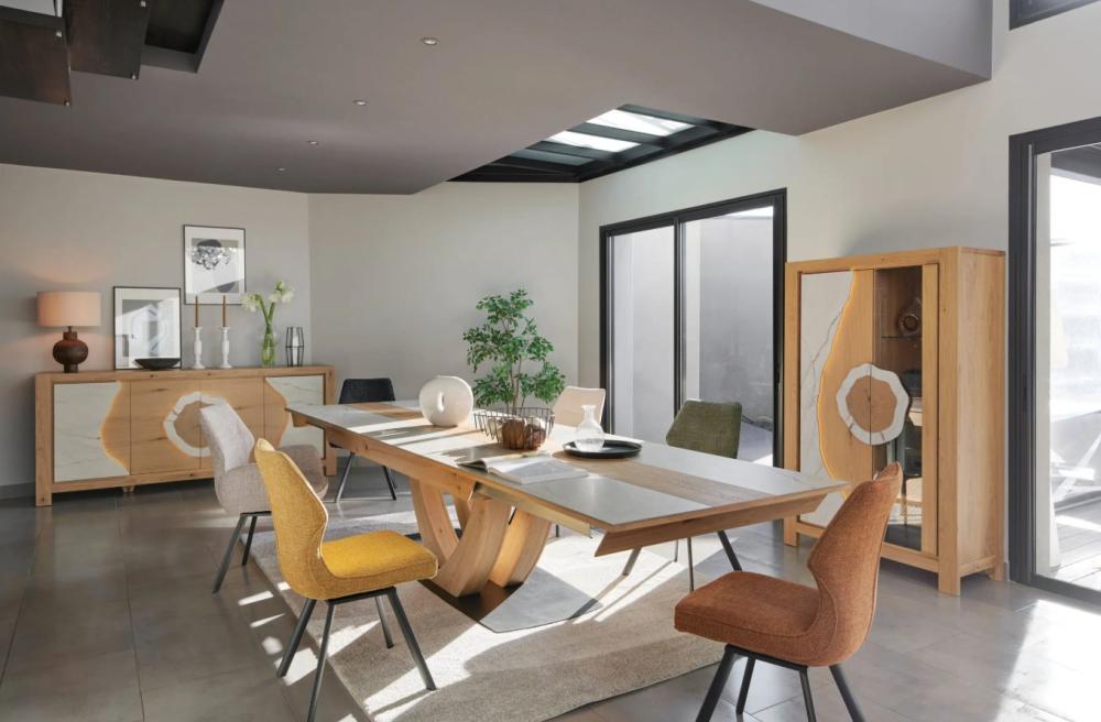 Déclinée en enfilades, vitrines, meubles TV, bibus, consoles, tables de salon et tables de repas, la collection Minérale s’adapte à tous les intérieurs contemporains. Les finitions en céramique beige veiné ou brun panaché renforcent son élégance naturelle et sa durabilité.